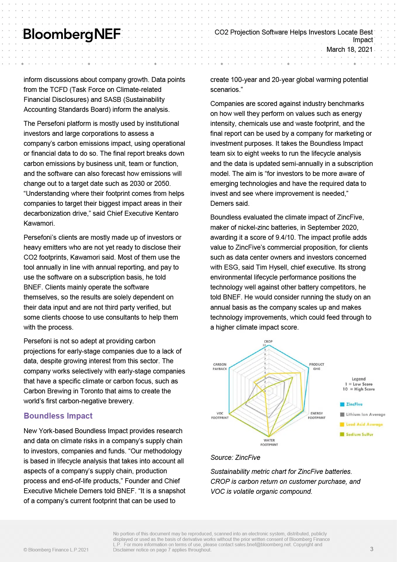 Boundless evaluated the climate impact of ZincFive, maker of nickel-zinc batteries, in September 2020, awarding it a score of 9.4/10. The impact profile adds value to ZincFive’s commercial proposition, for clients such as data center owners and investors concerned with ESG, said Tim Hysell, chief executive. Its strong environmental lifecycle performance positions the technology well against other battery competitors, he told BNEF. He would consider running the study on an annual basis as the company scales up and makes technology improvements, which could feed through to a higher climate impact score.